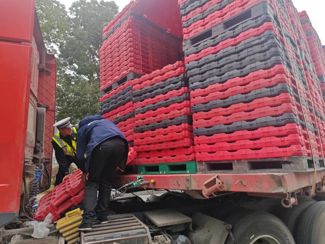 12月15日12许,江口县梵净山大道马鞍山大桥头路段,一辆重型半挂牵引车因货物散落停滞,导致交通受阻。原来,该车在转弯时因惯性导致部分塑料托盘滑落,卡滞在车头与车身连接处,致使车辆无法移动,阻塞直行车道。