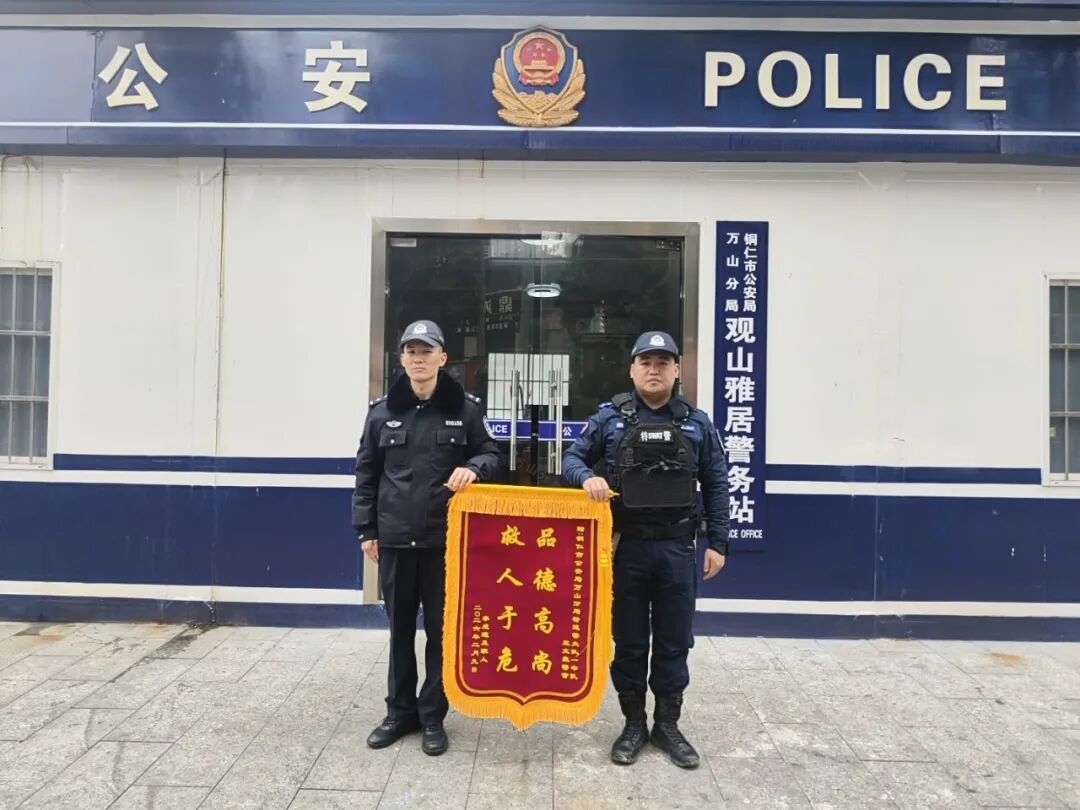 2月11日,家住万山区的任先生专程来到万山区观山雅居警务站,将一面印有“品德高尚、救人于危”的锦旗,送到特巡警大队队员王文豪手中,感谢他在危急时刻挺身而出、及时救助其家属。