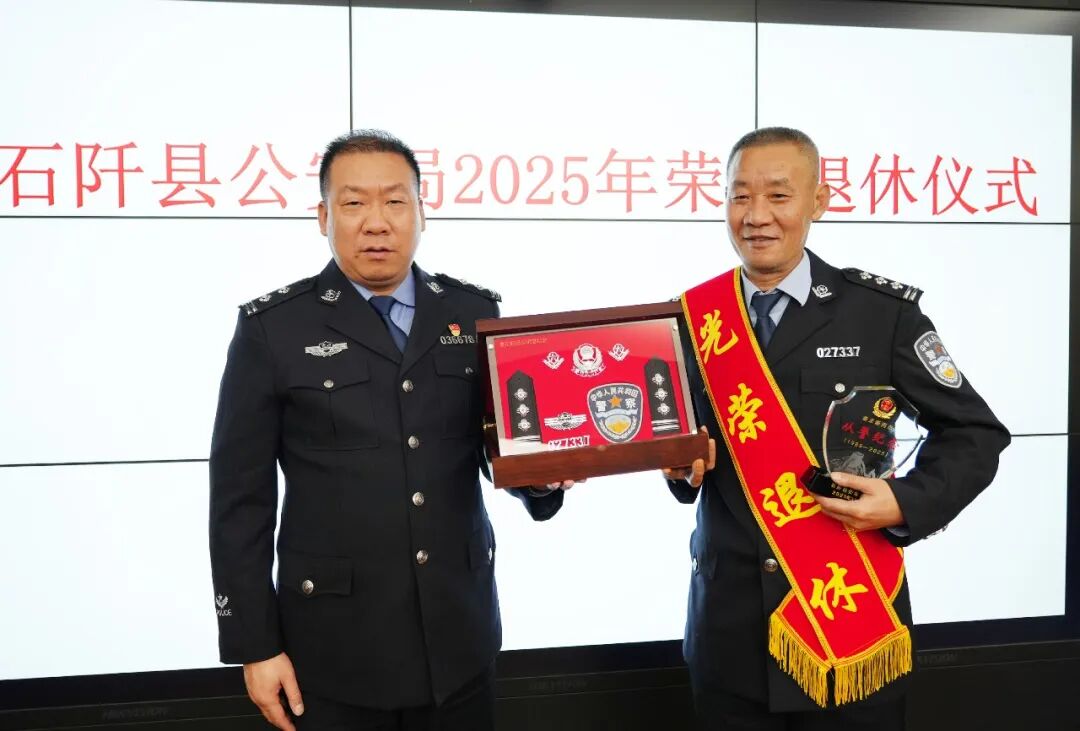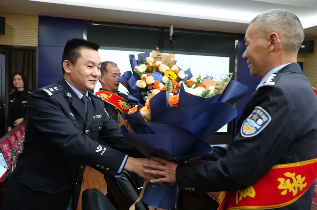 “你们是全体民警辅警学习的榜样和石阡公安事业的功臣,在各自的工作岗位上都作出了卓有成效的努力和贡献。”“这些年,石阡的街巷更平安了,乡亲们的笑容更踏实了,这里面有你们再也回不来的青春。这身警服,你们穿出了山的筋骨、水的韧性。今天,你们把肩上的担子稳稳地放下了,但‘人民警察’这四个字,已经长在你们骨子里了。以后,这里永远是你们的家,常回来看看,喝杯茶,说说心里话。”