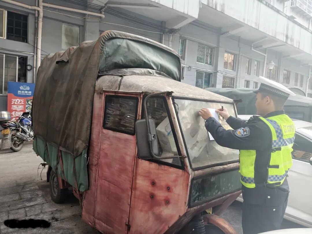 “您好,您的车长期未使用,占用公共资源,请配合我们整改!”秉持“宣传先行、告知到位、人性化执法”原则,交警大队联合小区业委会完成细致摸排,确认共7台符合“僵尸车”特征的车辆。随后,民警逐一在车辆上张贴《告知单》,明确告知车主处置要求及期限,并协调物业通过业主微信群等渠道广泛通知,要求车主7个工作日内自行处置车辆,逾期将依法实施强制拖移。