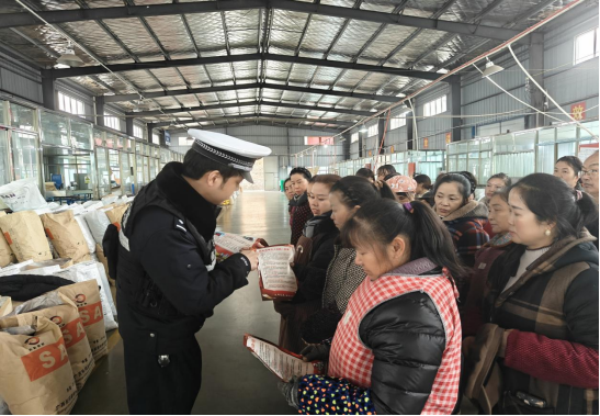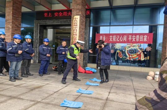 在贵州中科星城石墨有限公司、万山区东奇电气有限公司的厂区内,民警辅警为员工讲解超员超载、疲劳驾驶、酒驾醉驾、无证驾驶、非法营运、不系安全带等违法行为的危害,发放“致外出务工人员的一封信”,提醒大家过年回家,一定不要乘坐非法运营车辆。