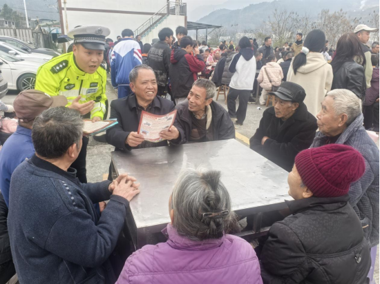 在村口的集市上,便携设备循环播放着交通安全警示片,一幕幕因不系安全带、骑乘摩托车不戴头盔、酒后驾驶引发的事故画面,让围观的村民不时发出感叹。民警们一边发放印有安全提示的年历、挂历和小礼品,一边耐心讲解“一盔一带”的重要性,提醒大家春节走亲访友时切莫忽视安全。