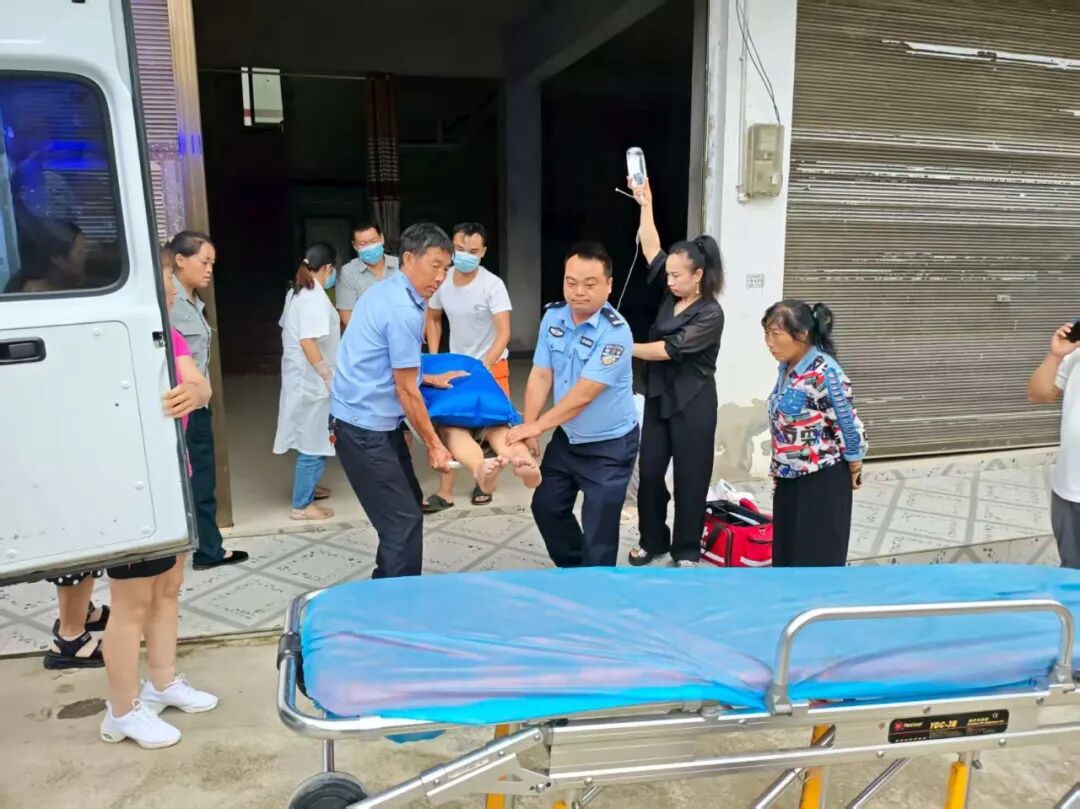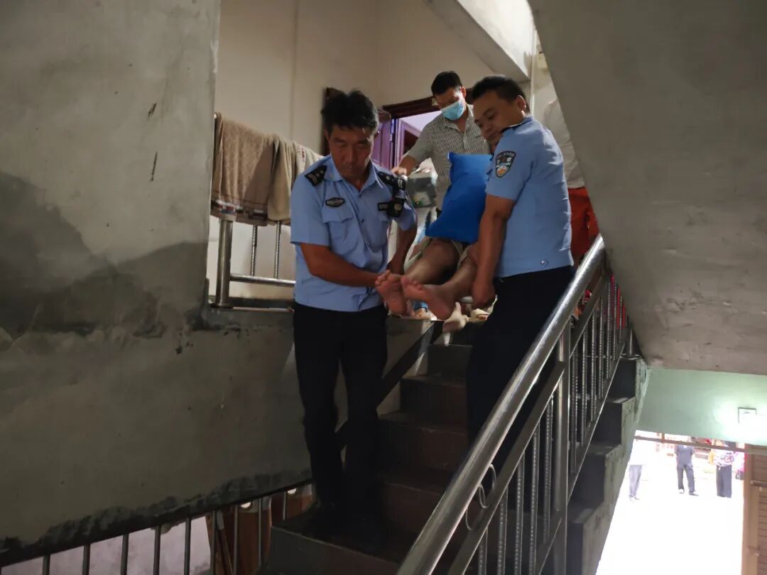 “患者后脑挫伤,疑似突发脑溢血,需立即送院!”当乡卫生院医务人员赶到现场后,对大爷进行了初步检查。随即,民警与医护人员一起将老人抬下楼护送至救护车上,紧急送医救治。