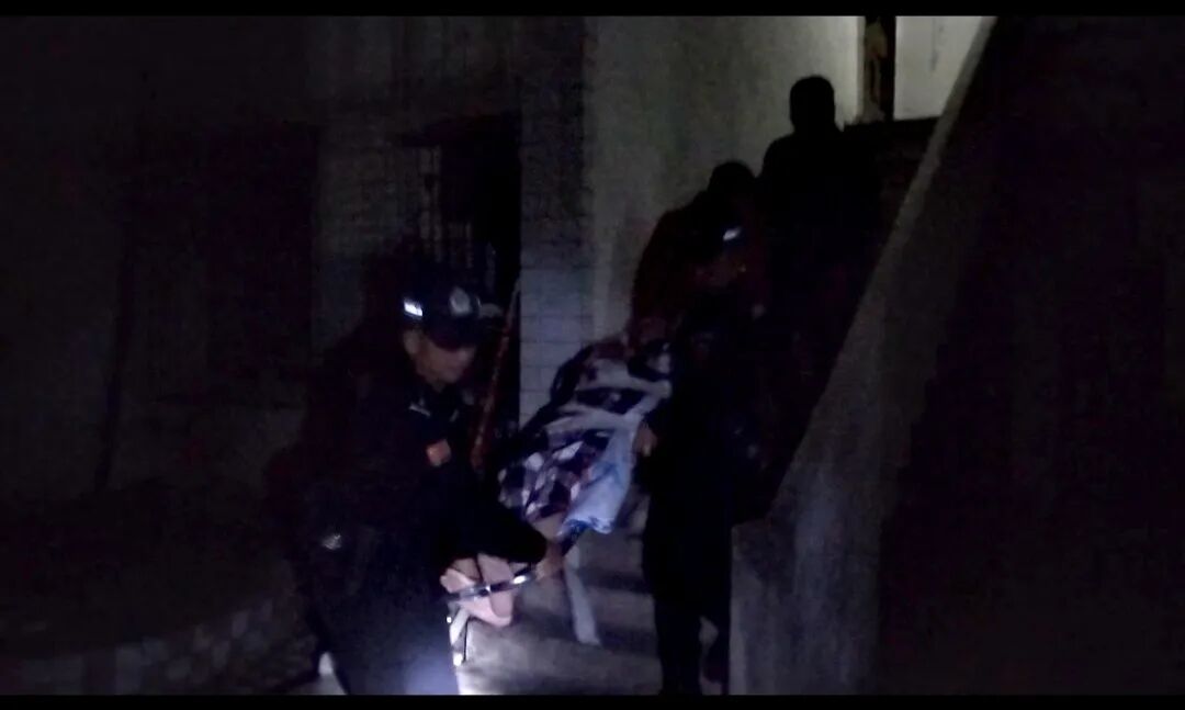 带队民警迅速分工,两名队员蹲身协助医护人员将患者平稳移上担架并固定妥当,其余队员则掏出随身携带的手电筒,在狭窄楼道内搭起一道“光墙”,照亮每一级台阶。