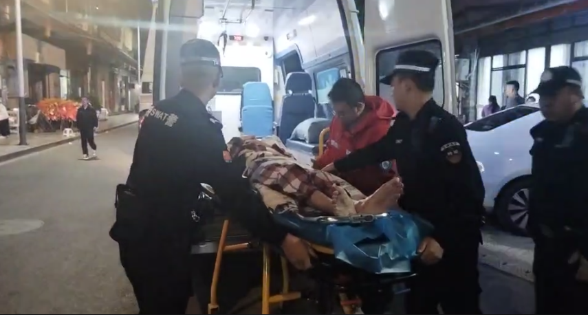 转运过程中,民辅警与医务人员密切配合,根据楼道宽度不断调整站位与姿势,前侧队员弯腰护着担架头部,后侧队员半蹲稳住尾部,每一步都走得格外谨慎,生怕颠簸加重患者不适。昏暗的光线下,藏蓝身影与白大褂相互交织,在狭窄的空间里形成了最坚实的守护屏障。
