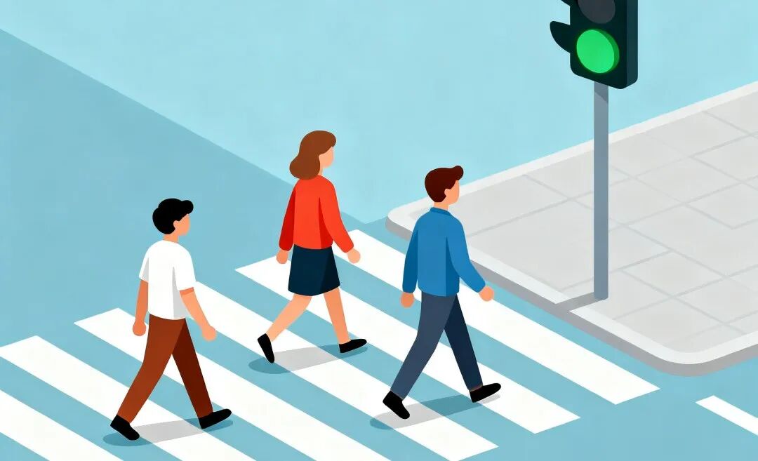 行人过街要走人行横道或行人过街设施,切勿翻越道路中央护栏,在有红绿灯的路口要根据红绿灯的指示通行。