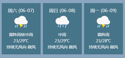 据气象资料分析,预计7~9日雷雨转中雨,具体逐日预报如下: